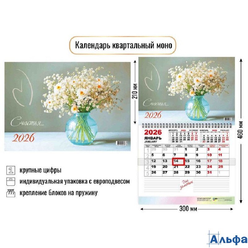 2026 Календарь 1-блочный квартальный Цветы 300 х 460 9470