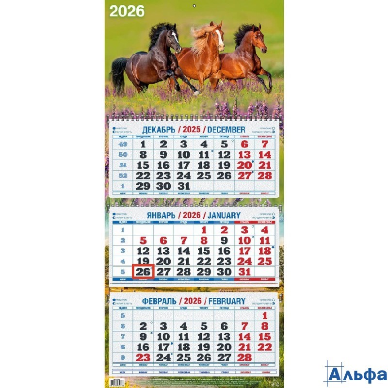 2026 Календарь 3-блочный 310х680мм Гребень Год Лошади. Вид 2 УФ-лак Атберг 4526002