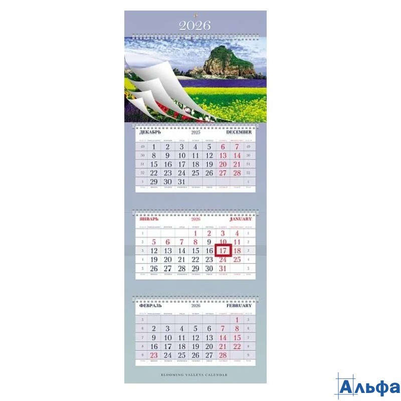 2026 Календарь 3-блочный (5 сменных постеров) 320х840мм Гребень Цветущие долины HATBER 3Кв4гр2ц_1153