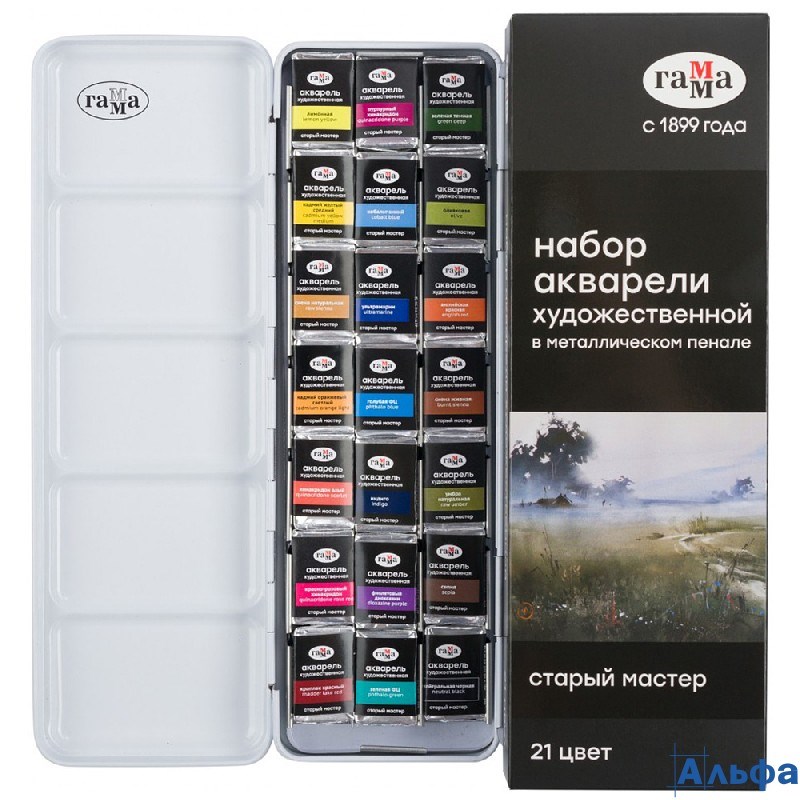 Акварель 21цв 2,6мл художественная без кисти кюветы метал.пенал Старый Мастер Гамма 200622_0121