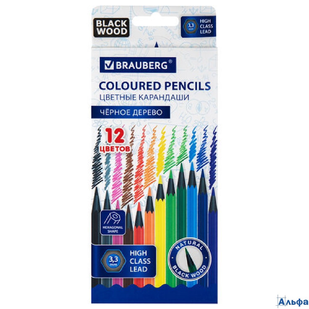 Карандаши цветные 12 цветов шестигранные грифель 3,3 мм черное дерево 181856 Brauberg