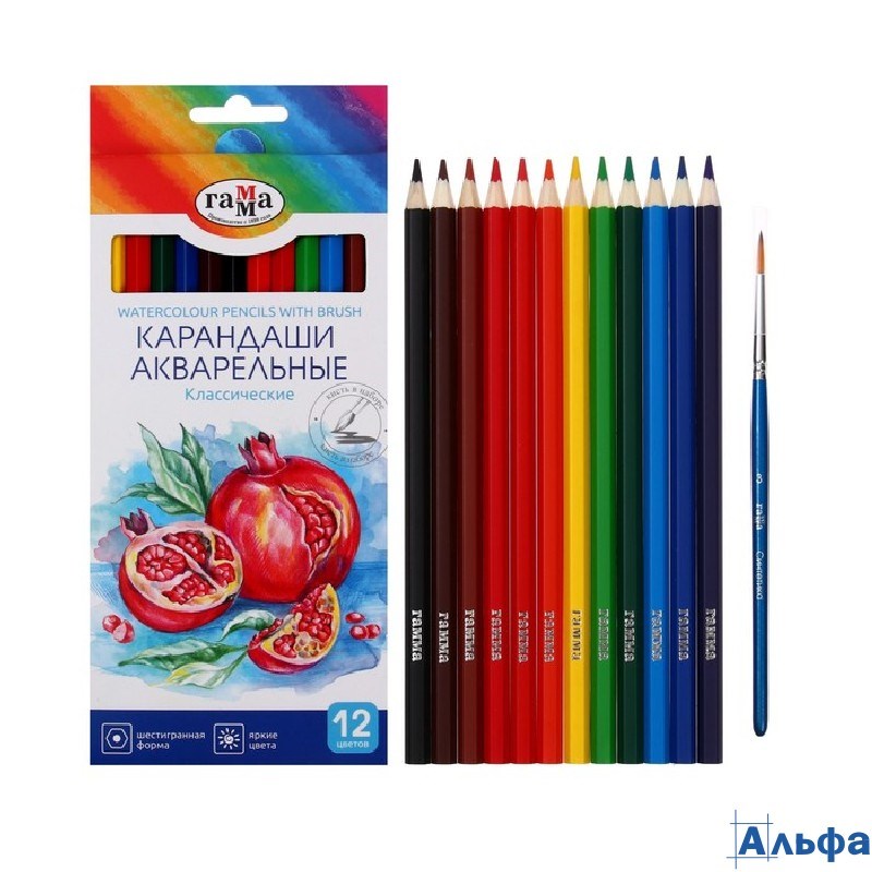 Карандаши цветные акварельные 12шт Классические 6-гранные заточенные с кисточкой картонная упаковка
