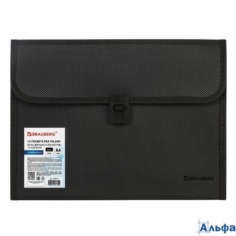 Папка для бумаг и документов с замком и 13 отделениями Brauberg HIT А4 пластик черная 229572