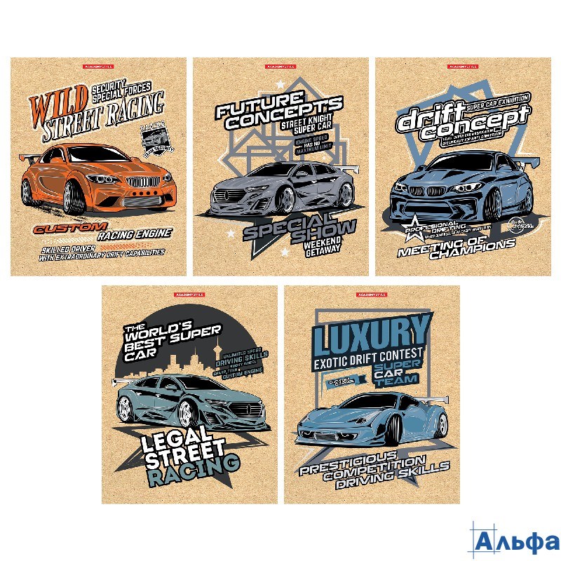 Тетрадь А5 48л клетка скрепка карт.обл. крафт Street racing тисн.фольгой ассорти Academy Style 14085
