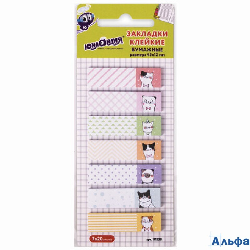 Закладки клейкие Юнландия бумажные Котики 45х12 мм с печатью 140 штук (7 цветов х 20 листов) 111358